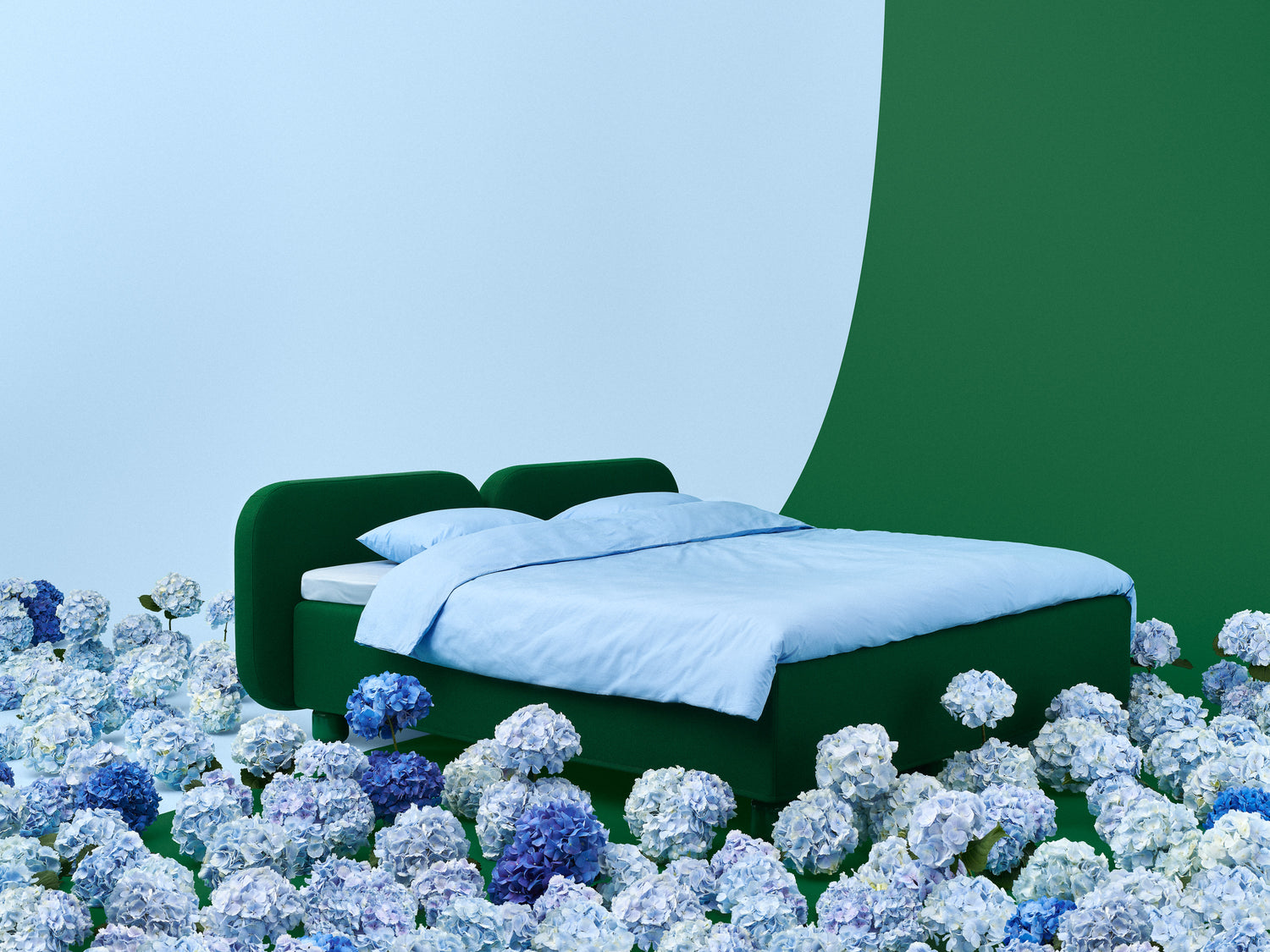 Floral set design for Hakola's marketing campaign filled with hundreds of hydrangeas and gerberas.